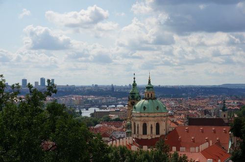 Tras cruzarlo tranquilamente nos dirigimos al siguiente hito importante del día: el Castillo de Praga. El trayecto pasa por uno de los laterales de la Iglesia de San Nicolás, pero ahora no la visitaremos, luego volveremos a pasar por aquí y tendréis la oportunidad de hacerlo. La subida al castillo la haremos a través de las escaleras de la calle Thunovská. Tras subirlas llegamos al distrito de Hradčany y a uno de los muchos miradores que hay a lo largo de la zona sur del castillo.