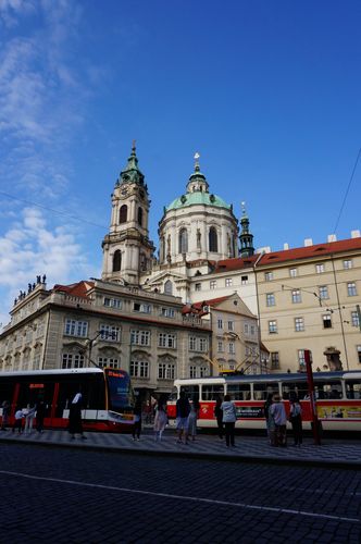 Tras esta intensa mañana visitando los rincones del Castillo necesitamos un descanso, ¡llegó la hora de almorzar! En el mapa he señalizado un acogedor restaurante de comida checa llamado U Magistra Kelly. Para llegar a él hay que seguir el siguiente tramo del recorrido unos 500 metros. Tras la comida nos disponemos a pasear por el Barrio de Malá Strana, para ello retrocedemos hasta la calle Nerunova. Bajando esta calle llegamos a la Iglesia de San Nicolás y su Campanario. No son de obligada visita pero si quieres hacerlo éste es el momento.