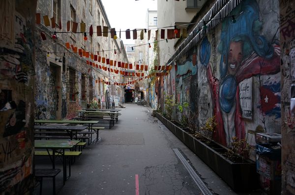 Y entre los dos patios el callejón mas rebelde de Berlín: Dead Chicken Alley (37). Tras la caída del muro surgieron numerosos movimientos culturales totalmente contrarios a los establecidos, y como estaba prohibido pintar en la murallas de la ciudad, unos jóvenes compraron este callejón para expresar sus ideas.