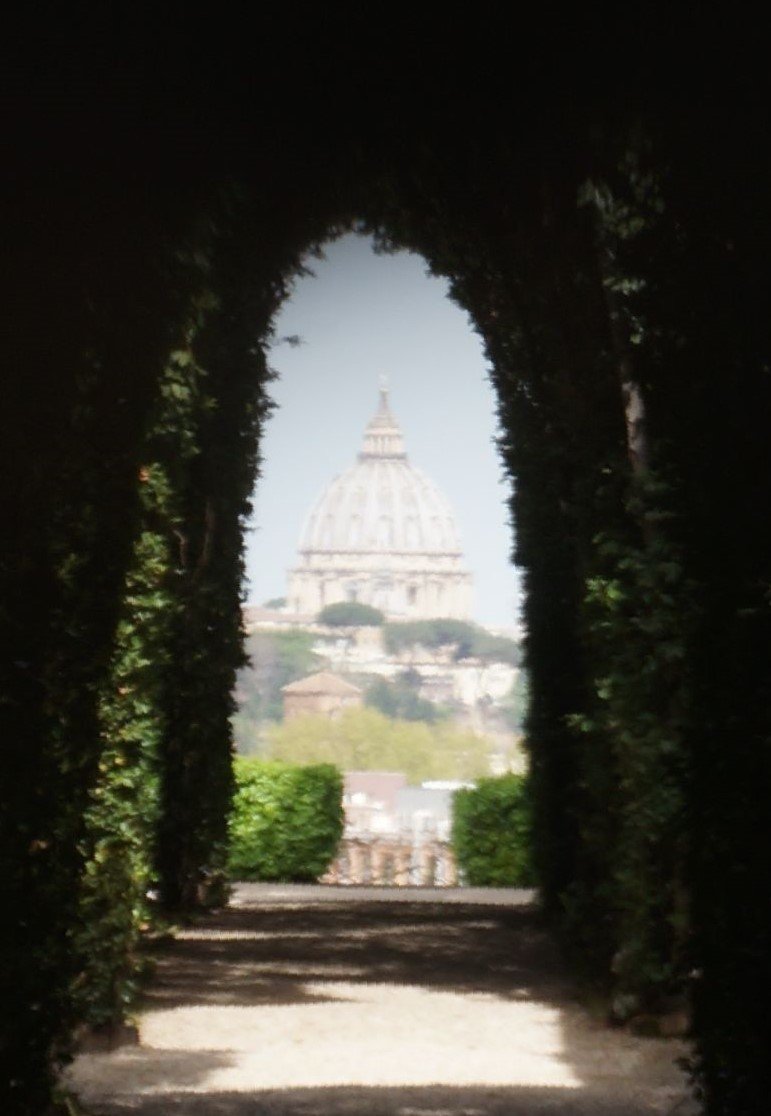 A solo unos 250 metros de los jardines está la famosa cerradura Buco della serratura di Roma (10) de Piazza Dei Cavalieri Di Malta. Al mirar por la cerradura se ve la cúpula de San Pedro entre cipreses, por esto es mejor ir antes de que se haga de noche. Suele haber cola para mirar y se puede intentar hacer una foto a través de la cerradura si la cámara es buena.